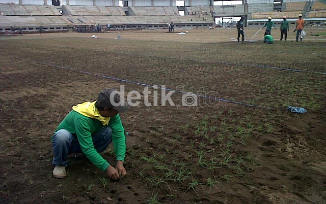 Sejumlah pekerja memasang rumput di Stadion Utama Sepakbola (SUS) Gedebage.